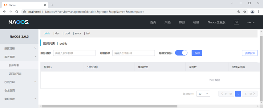 8. 使用浏览器访问“http://localhost:1111/nacos/”,若成功访问 Nacos Server 的控制台,则说明 Nacos 集群部署成功,如下图。